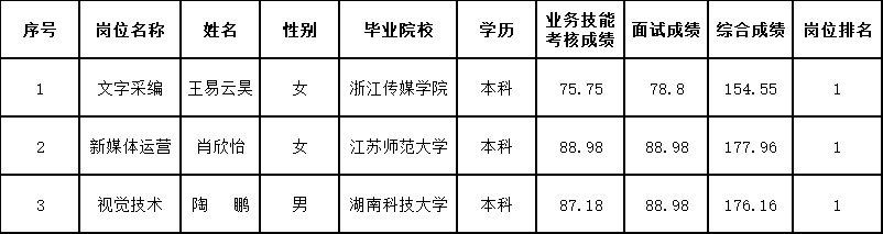 經資格審查、業務技能考核、面試、政治考察、體檢等程序,按照綜合成績從高分到低分,確定王易云昊等3名同志為吉安消防全媒體中心擬聘用人員,現將名單予以公示。