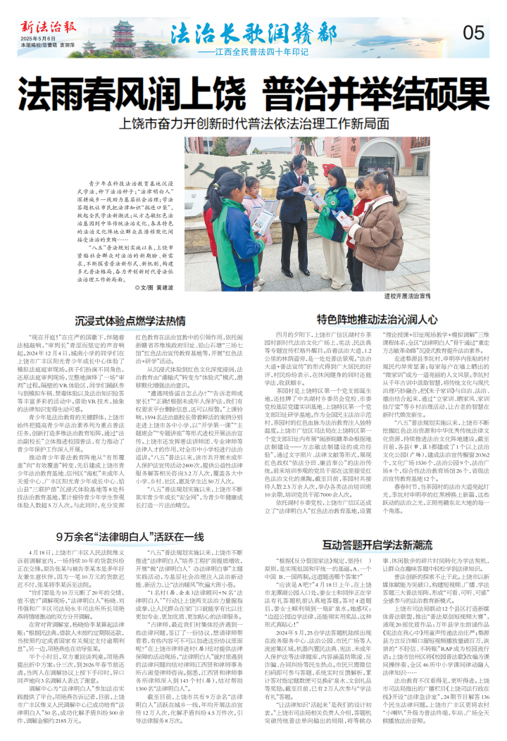 青少年在科技法治教育基地沉浸式學法,種下法治種子;“法律明白人”深耕城鄉一線助力基層社會治理;學法答題機讓市民把法律知識“揣進口袋”,掀起全民學法新潮流;從方志敏紅色法治基因到中華傳統法治文化,各具特色的法治文化陣地讓群眾在潛移默化間接受法治的熏陶……
