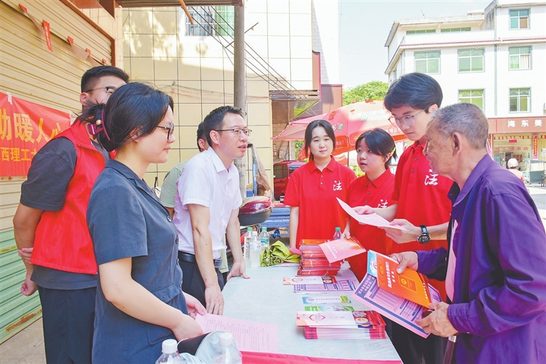 在黃安村圩場宣講臺前,學生王鑫妮熟練地架起手機開啟直播。椅子還未坐熱,便有村民拿著皺巴巴的合同擠到她面前進行咨詢。“年輕人,來幫我看看這承包協議有沒有漏洞?”王鑫妮聞聲接過合同逐項查看,并將其作為鮮活案例同步在直播間講解,對其中存在的風險進行剖析。“打開手機就能學法,還能問自家遇到的難題,可太方便了!”村民楊群贊不絕口。