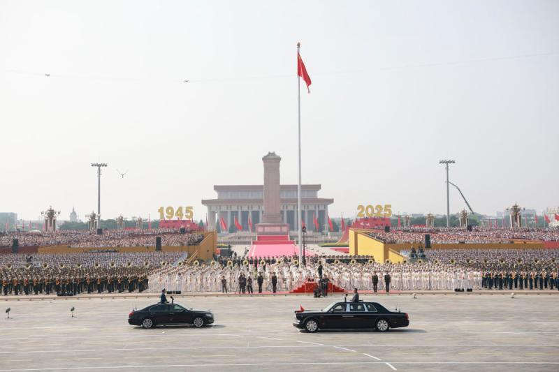 9月3日,紀念中國人民抗日戰爭暨世界反法西斯戰爭勝利80周年大會在北京天安門廣場隆重舉行。這是中共中央總書記、國家主席、中央軍委主席習近平檢閱受閱部隊。新華社記者 李剛 攝