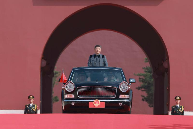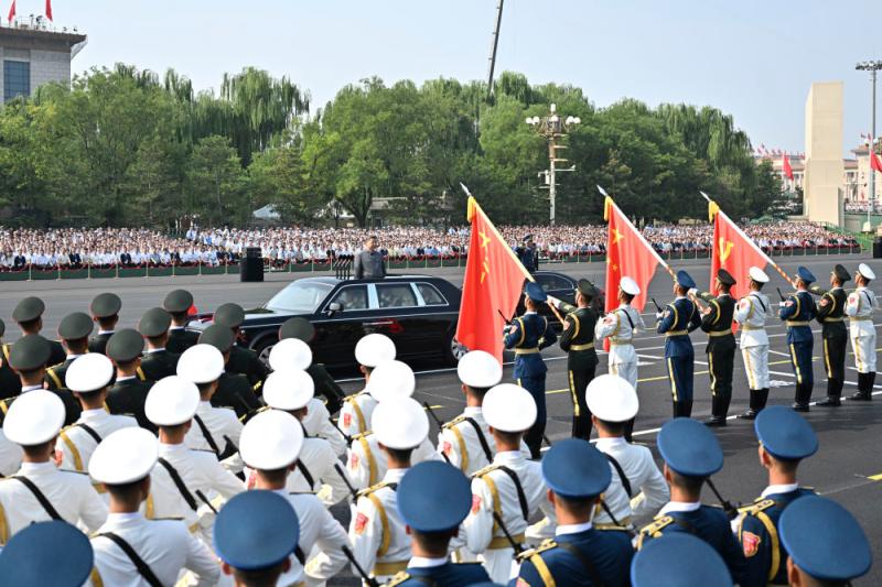 9月3日,紀念中國人民抗日戰爭暨世界反法西斯戰爭勝利80周年大會在北京天安門廣場隆重舉行。這是中共中央總書記、國家主席、中央軍委主席習近平檢閱受閱部隊。新華社記者 李剛 攝
