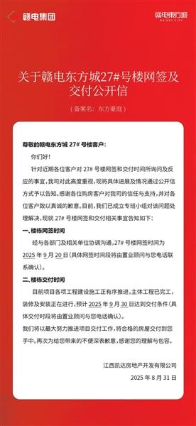 報道刊發后,此事迎來最新進展,經熊女士與開發商友好協商,最終退回了她此前支付的首付款。此外,該樓盤開發企業江西凱達房地產開發有限公司(下稱“凱達公司”)在8月31日發布公告稱,已成立專班小組對該問題處理解決,明確27#樓(公告稱27#號樓)網簽時間為9月20日。