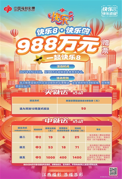 福彩快樂8,向快樂出發!9月12日起,江西省福利彩票發行中心(以下簡稱江西福彩)在全省開展“快樂8·快樂購”988萬元贈票活動,對快樂8游戲“選九玩法12碼復式”投注彩票“買就送”,對快樂8游戲單票金額20元及以上的“選二”“選三”“選五”玩法的中獎彩票“中就送”。