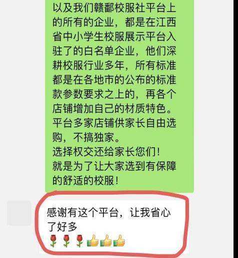 更讓人感動的是,家長們不僅滿意收貨,更主動向平臺點贊稱:“贛鄱校服社,還挺靠譜的!”
